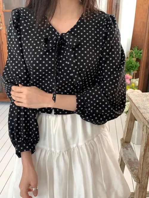 リボンボタンVネックシャーリングクロップド小花柄ブラウス・B1959741