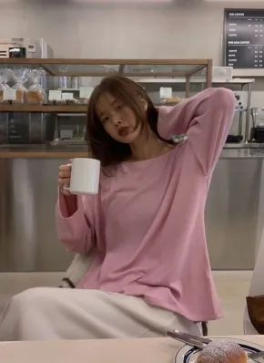 シンプルラウンドネックルーズ長袖無地カラーTシャツ