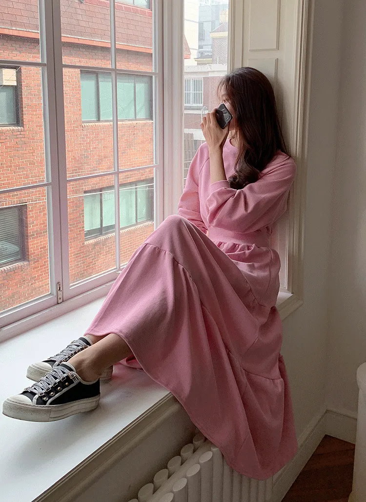 裏起毛ティアードウエストゴムロング長袖ワンピーストレーニング