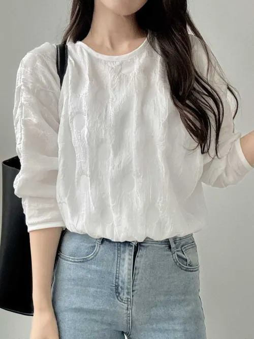 ラウンドネックウエストゴム長袖エンボスブラウス・B1959849