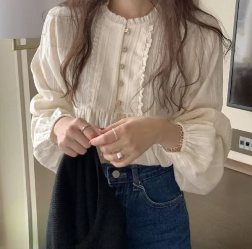 レースコットンボタンパフスリーブ長袖フリル ネックブラウス・B1960306