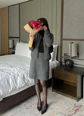 ツイードノーカラー肩パッドフェイクポケットクロップドHラインセットアップ